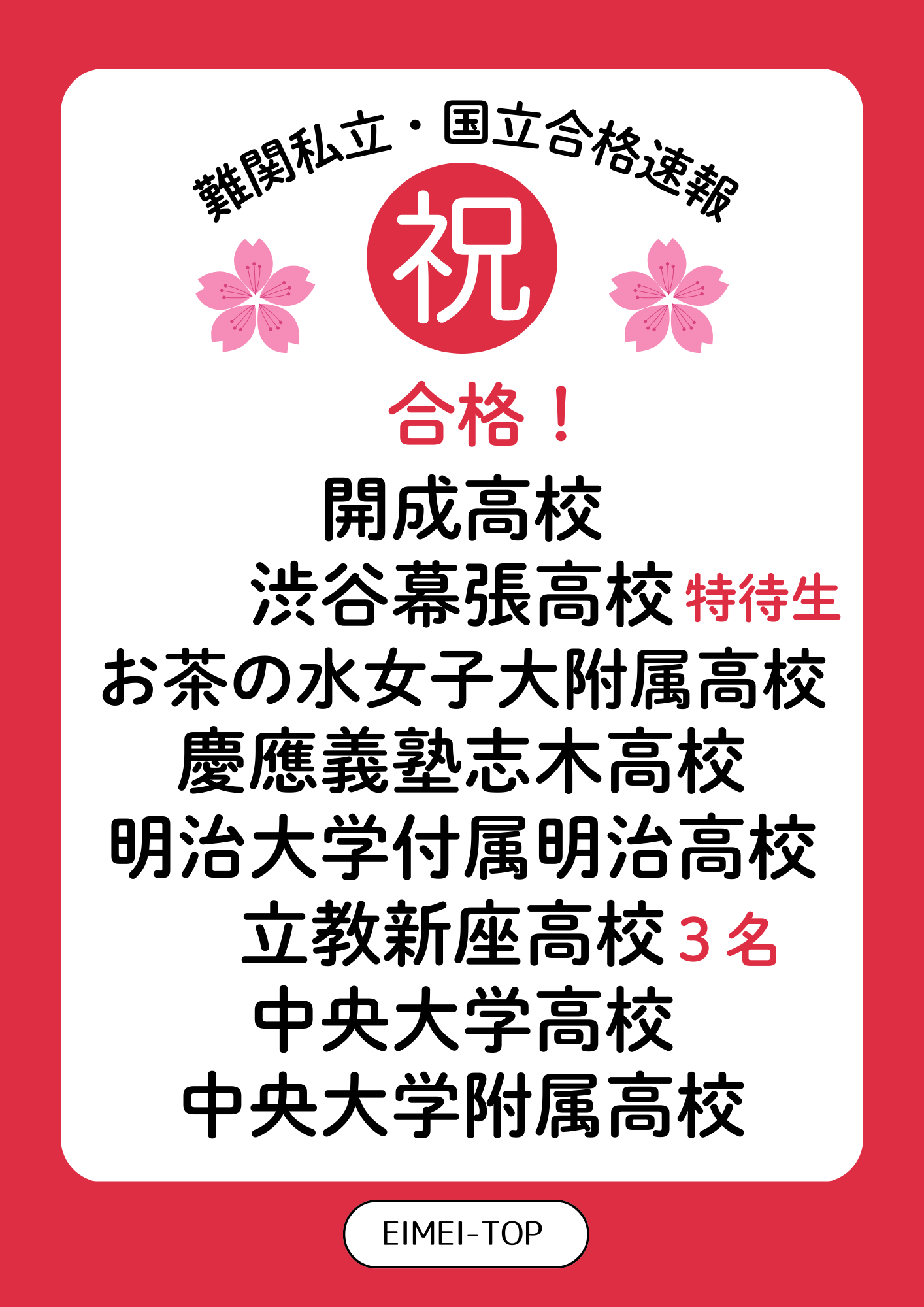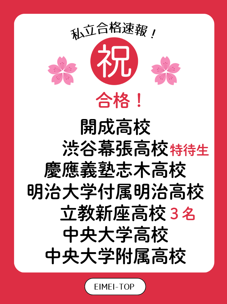 EIMEI-TOPより、今年のTOP生の合格速報をお伝えします! 開成高等学校 合格!!!!!🌸 素晴らしい、、、、、!!!よく頑張りました✨️✨️ […] -