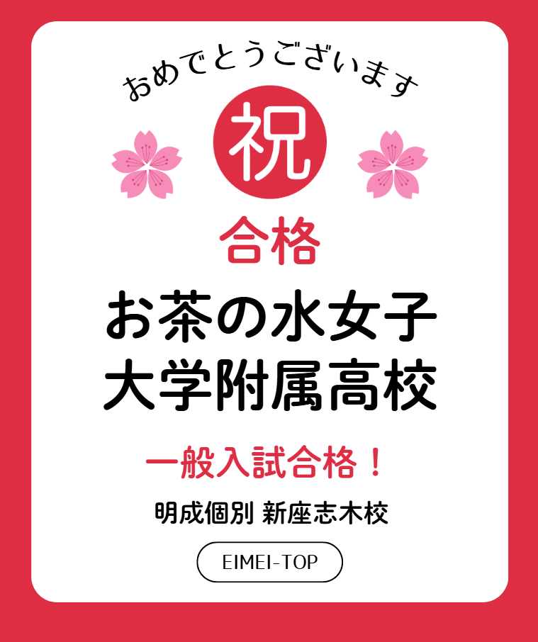 EIMEI-TOPより、今年のTOP生の合格速報をお伝えします! お茶の水女子大学附属高等学校 合格!!!!!🌸 素晴らしい!!!よく頑張りました✨️✨þ […] -