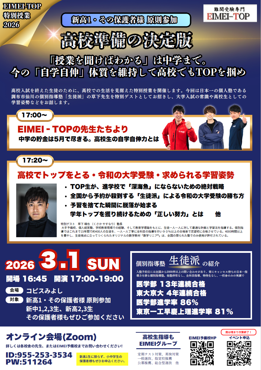 【新高1・保護者様 必見👀】特別イベント開催🔥 高校生活で、最高のスタートダッシュを切るための特別イベントを実施します! 今回は、日本一の個人塾「生徒派」の草下先生をゲストに招き、学年 […] -