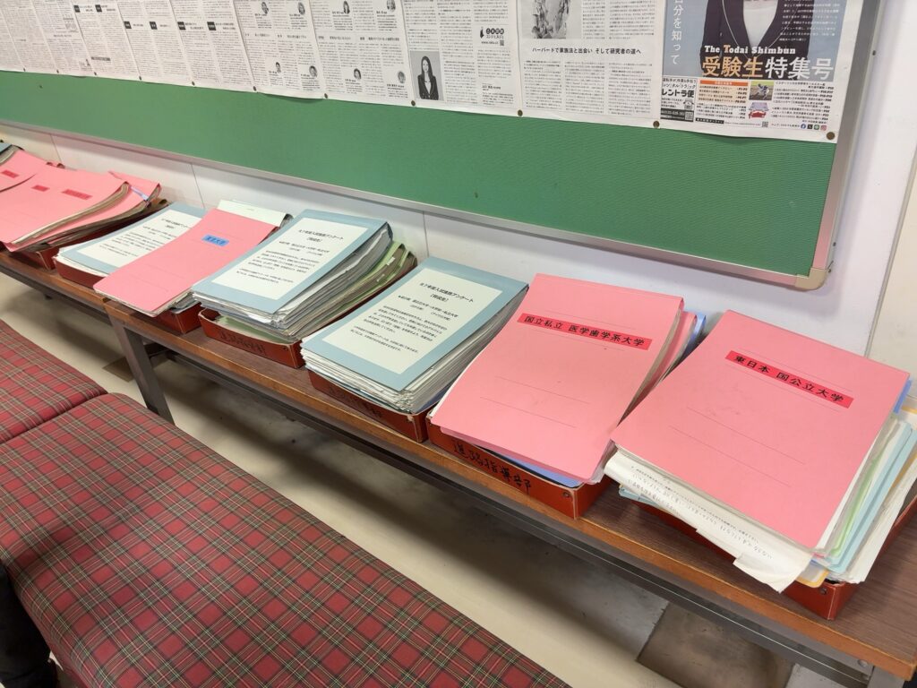 図書室の前に置いてあるこれは、歴代の卒業生達が残してきた受験体験記です。東大、京大など進学校別に分けて置かれています。写真では伝わりませんが、すごい分厚さです。生徒はこれを自由に読めるので、休み時間になると受験生たちが並んで読んでいるそうです。