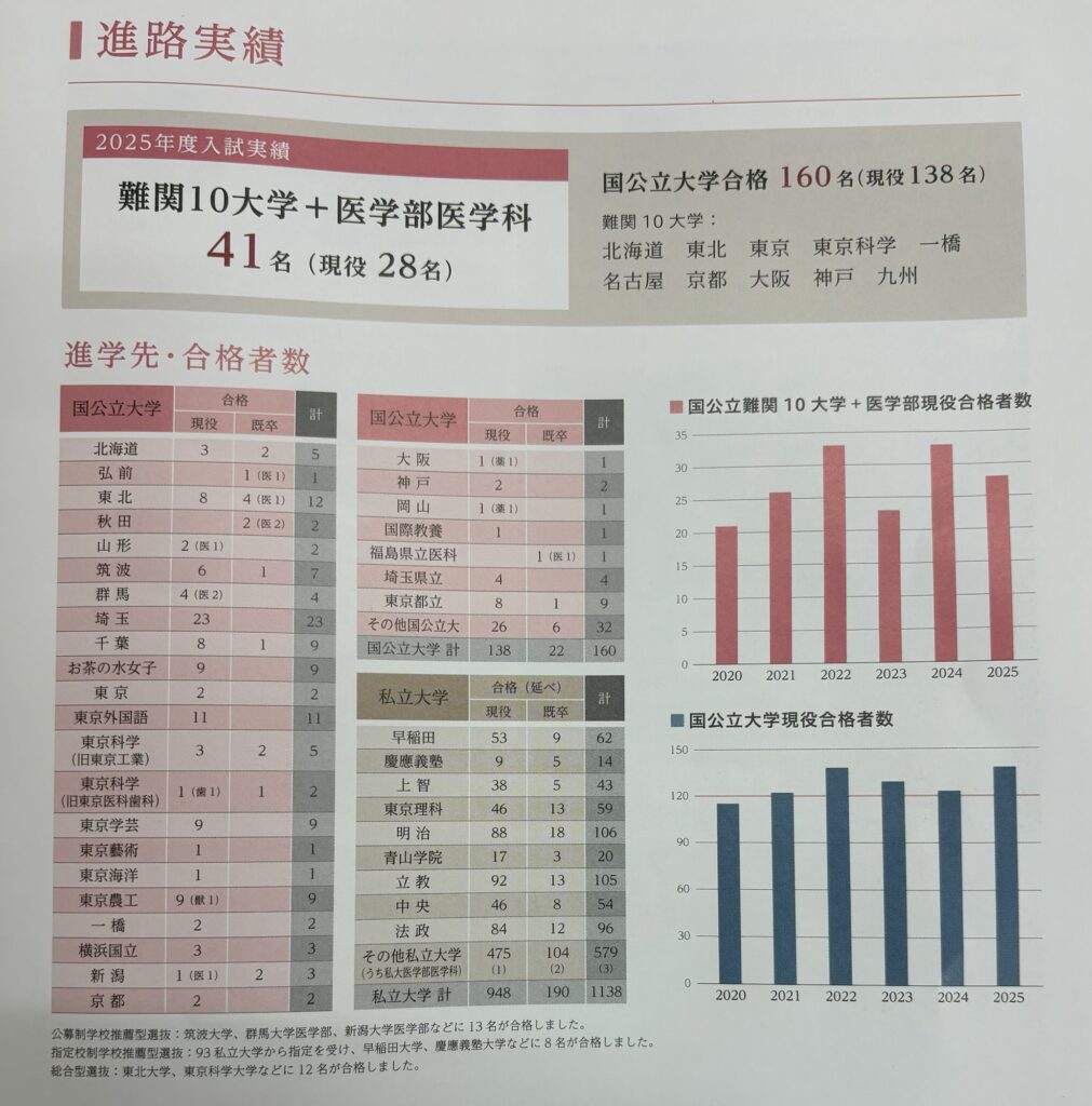 男子校は、「浪人してでもワンランク上の大学へ」という挑戦志向がある一方で、女子校は「頑張るけど、浪人はせずに行ける所へ」という現役志向・安定志向の子が多いものです。そんな中で、この結果はすごいことで、決して他の進学校と比べて質が落ちているということはなさそうです。
