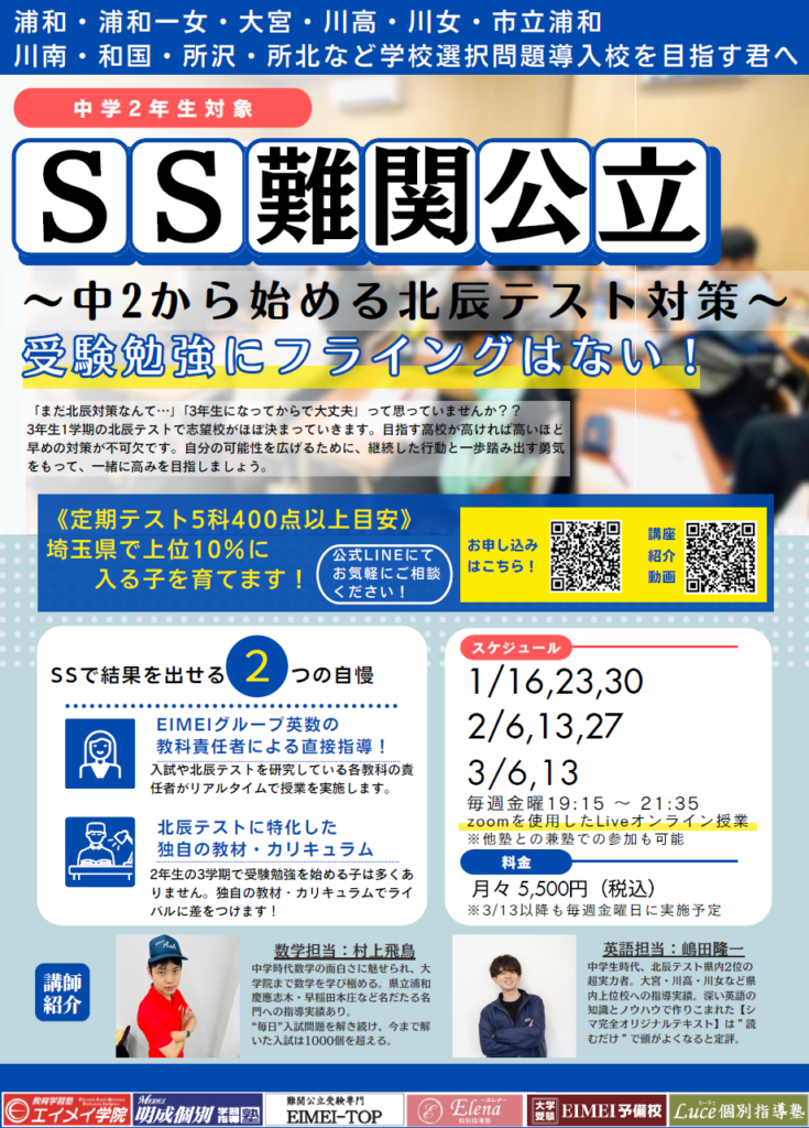 そして、3学期からSS難関公立《Kクラス》がスタートします!学校選択問題以上の高校を目指す人は、ここから受験勉強をスタートしましょう。
