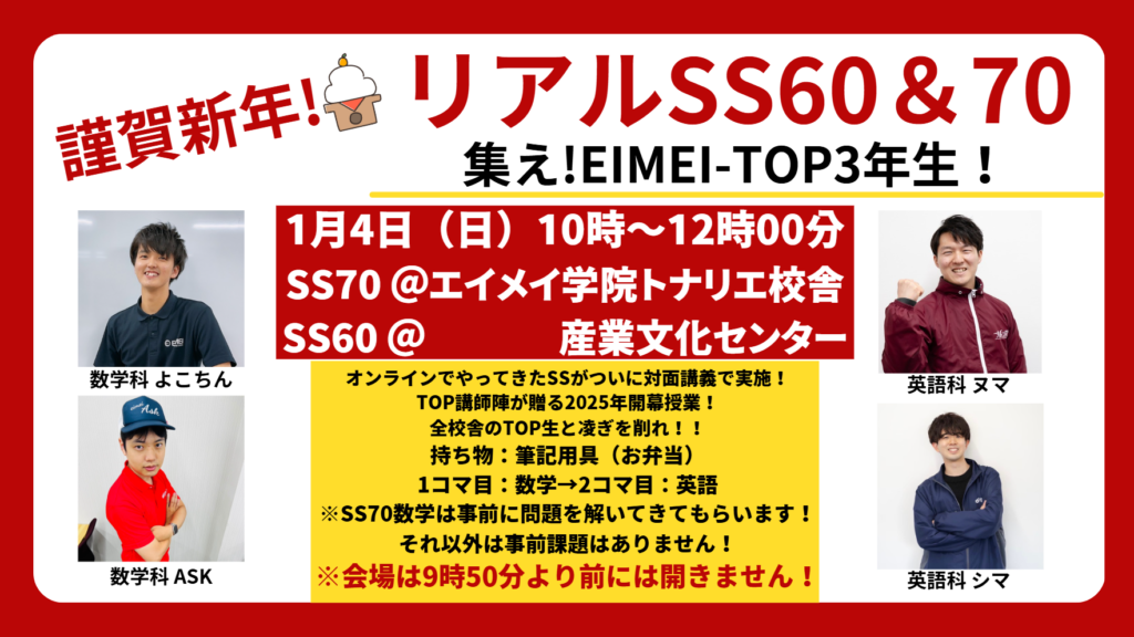 冬休み中はSS講座はありません。大勉強大会を全力で頑張ってください!