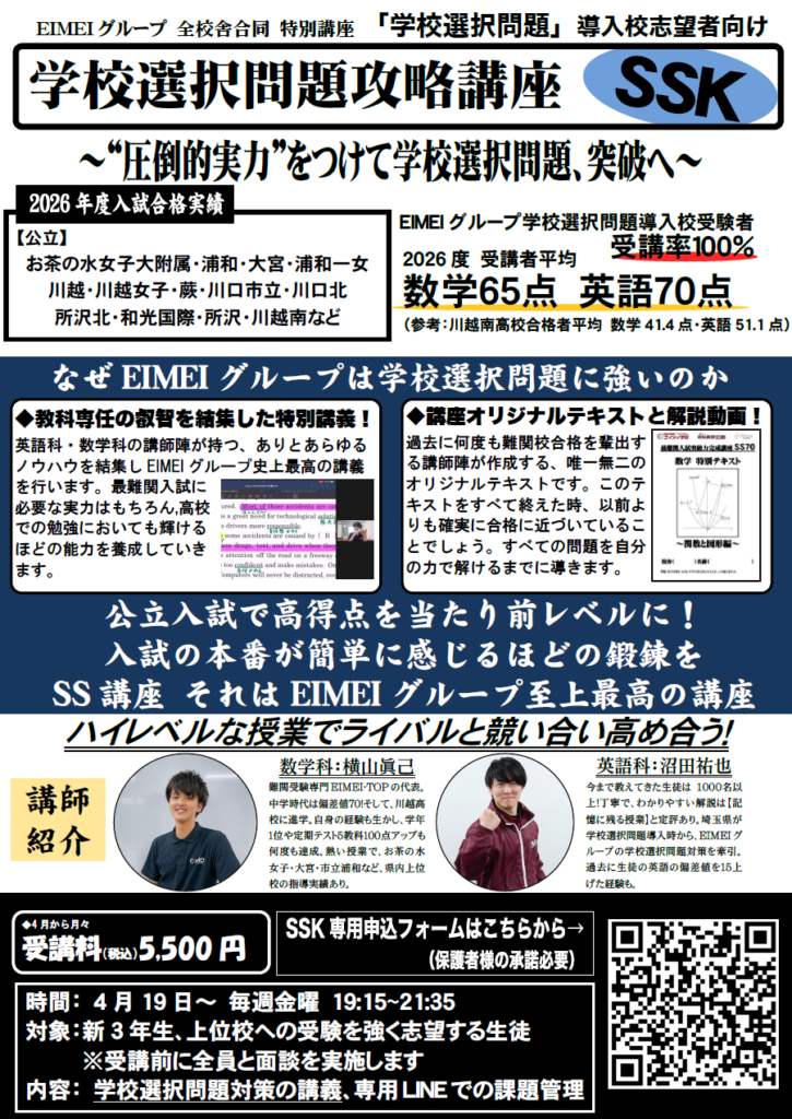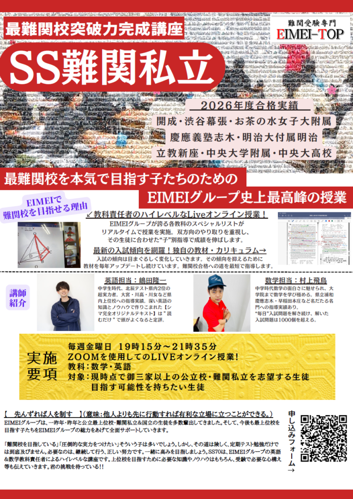 今年、難関私立に受かった子たちは、漏れなく1・2年生の時からSS講座に参加し、力を伸ばしていきました。定期テストを超えた内容を学習することで、3年生になったとき、他の同級生とは数段違う景色を見ることが出来ます。