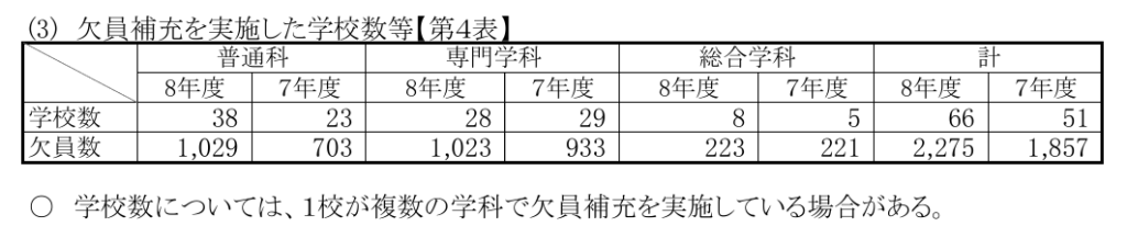 もう一つ、驚くべきデータがあります。 今年度、欠員補充を実施した学校は66校、募集人員は2,275人にのぼりました。 これは2012年度以降で過去最高の数字です。